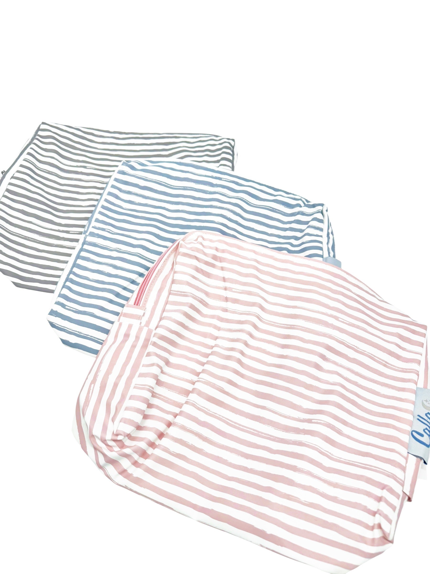 Keep messes contained with our Everything Wet Bag—the ultimate solution for parents on the go! This waterproof, wipeable bag handles dirty diapers, wet swimwear, and beyond with ease. Machine washable for quick cleanups, it packs flat for convenient travel. Choose from charming brushed stripe designs in soft gray, pink, or blue, and add a personal monogram to make it uniquely yours. Durable, practical, and stylish—because life's little accidents shouldn't cramp your style!