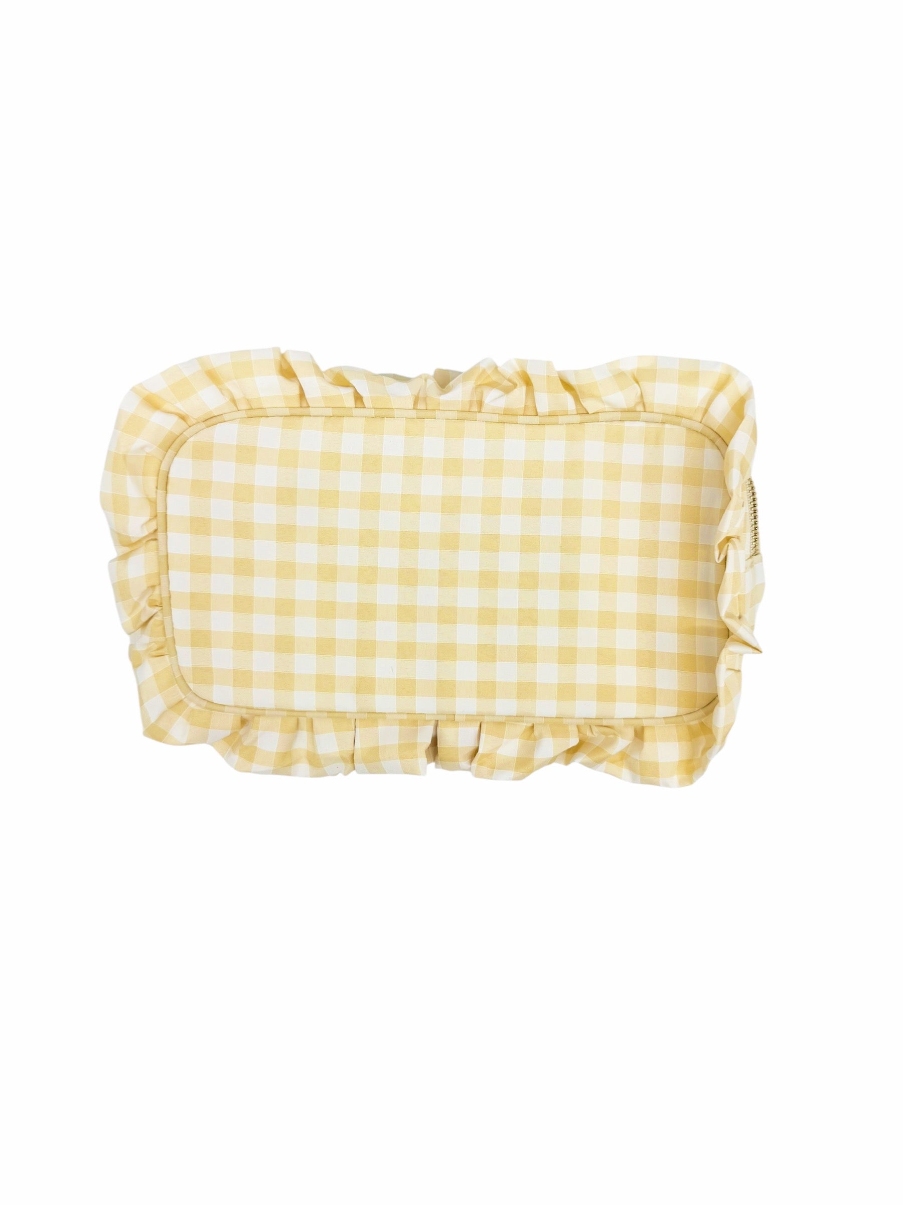 This charming gingham pouch is your go-to companion for keeping makeup, jewelry, and travel essentials perfectly organized. Measuring 10 x 5 x 2 inches, it's the ideal size for bridesmaid gifts, cosmetic storage, or packing on-the-go adventures. The cheerful gingham print pairs beautifully with a gold zipper, while the soft lining inside makes cleanup a breeze. Add a personal monogram to make it uniquely yours—a thoughtful touch that transforms this practical pouch into a treasured keepsake.